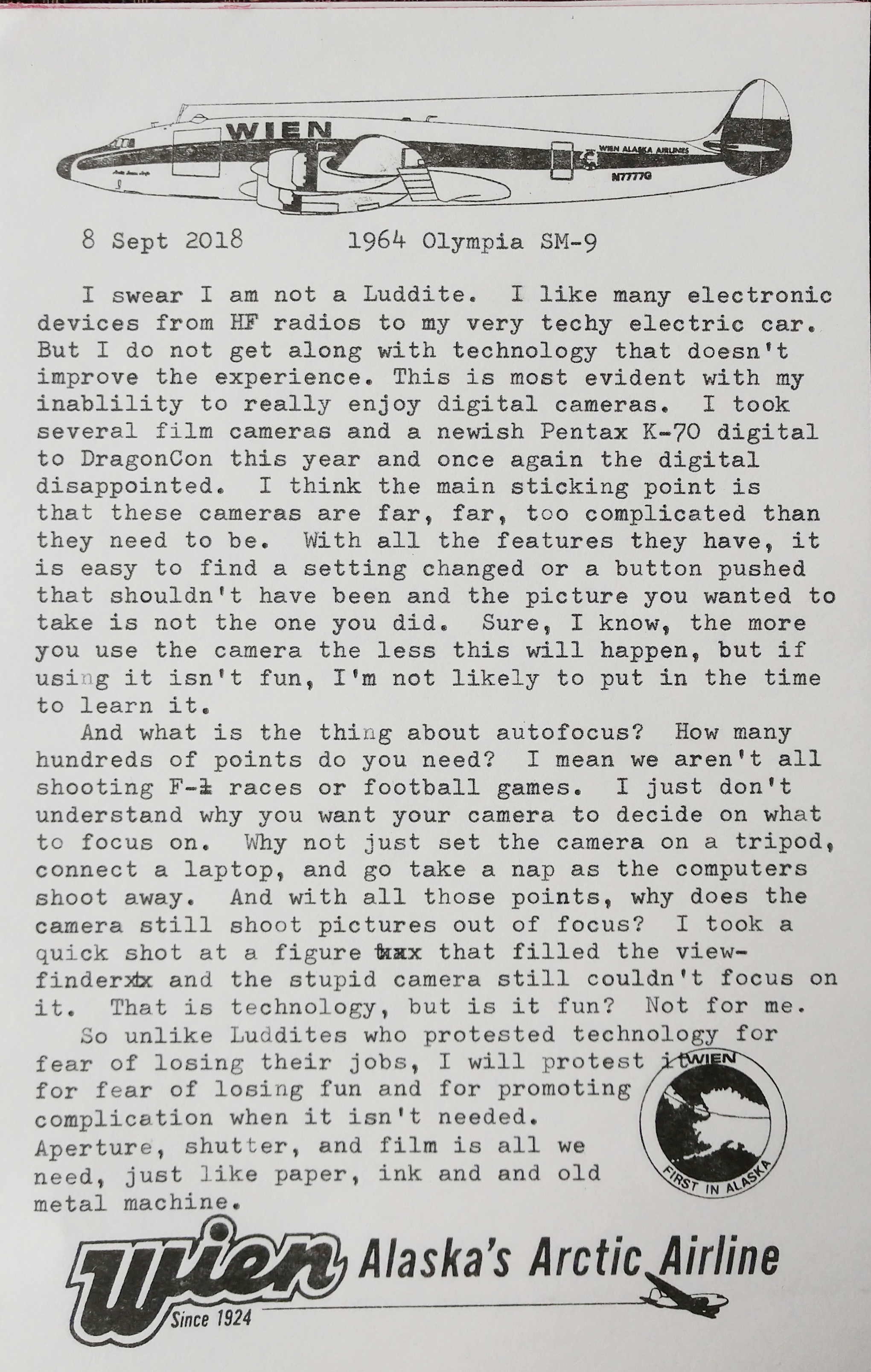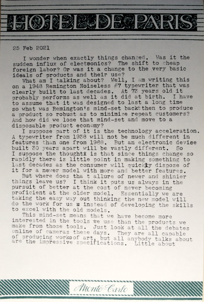 I know, many moons have passed since I put in an entry here. I hope to rectify that in the future with more regular thoughts posted. I have some new typewriters to test out with typecasts, and a few cameras I’d like to talk about.